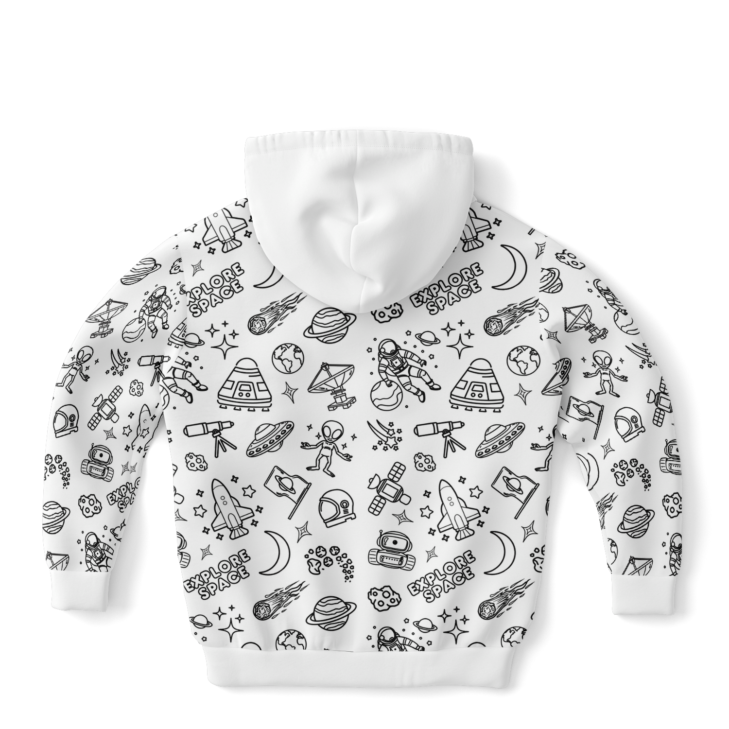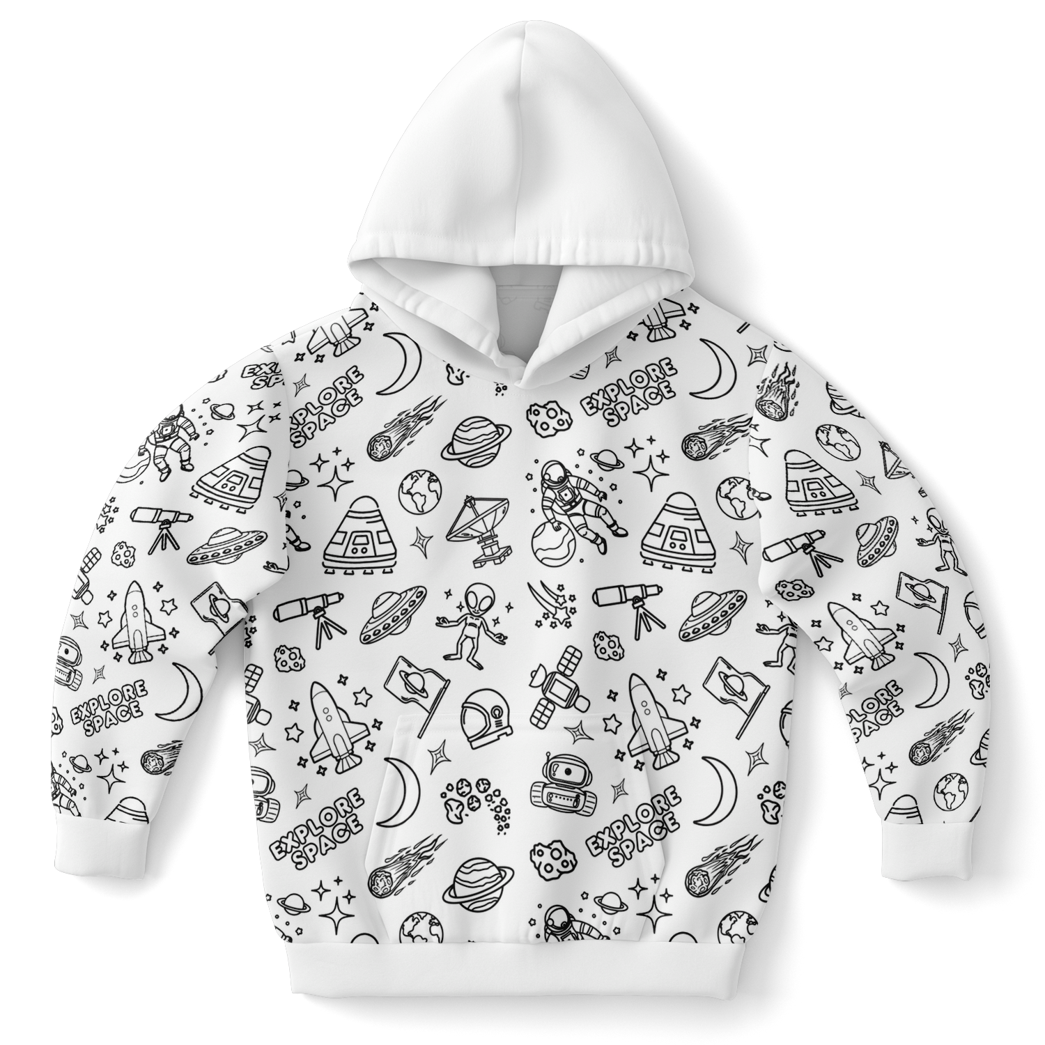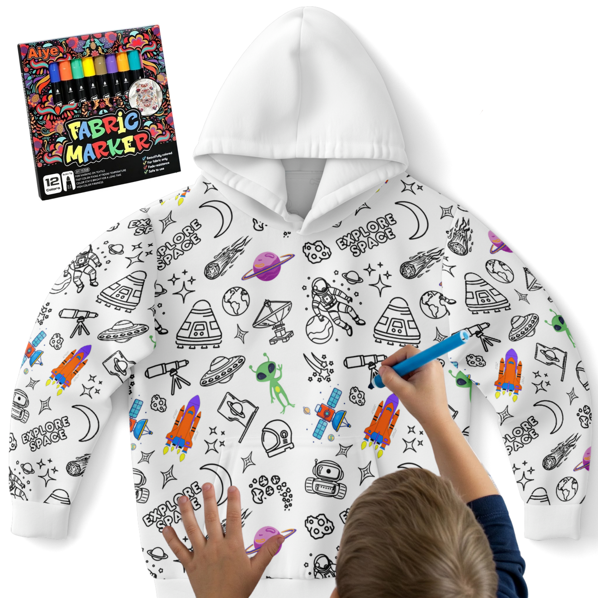 Blast off into a galaxy of colour with the Space DIY Colour-It-Yourself Hoodie! Packed with rocket ships, planets, and stars, this hoodie is the ultimate canvas for aspiring astronauts and cosmic creators. Reach for the stars and make it uniquely yours!